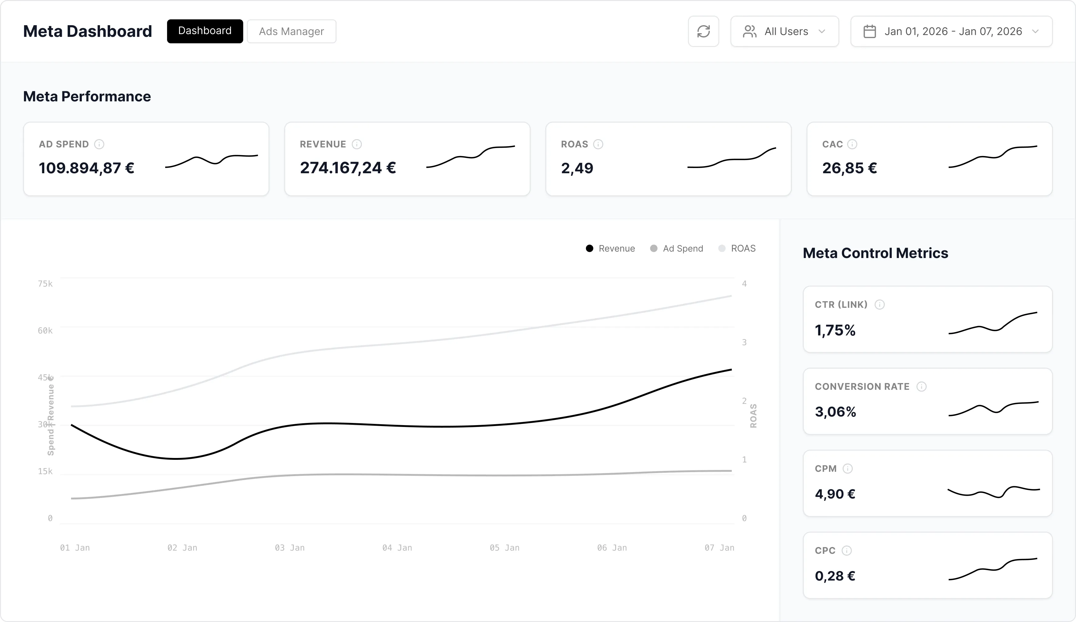 Our channel dashboards are optimized for performance marketers, CMOs, and anyone who is responsible for individual channels. Each channel — Meta, Google, TikTok, Pinterest, Microsoft Ads, Outbrain or Taboola — has its own dashboard that provides both a high-level overview and in-depth analysis. This means that you no longer control your channels by feeling, but on the basis of real performance data — attribution-based, GDPR-compliant and in real time.